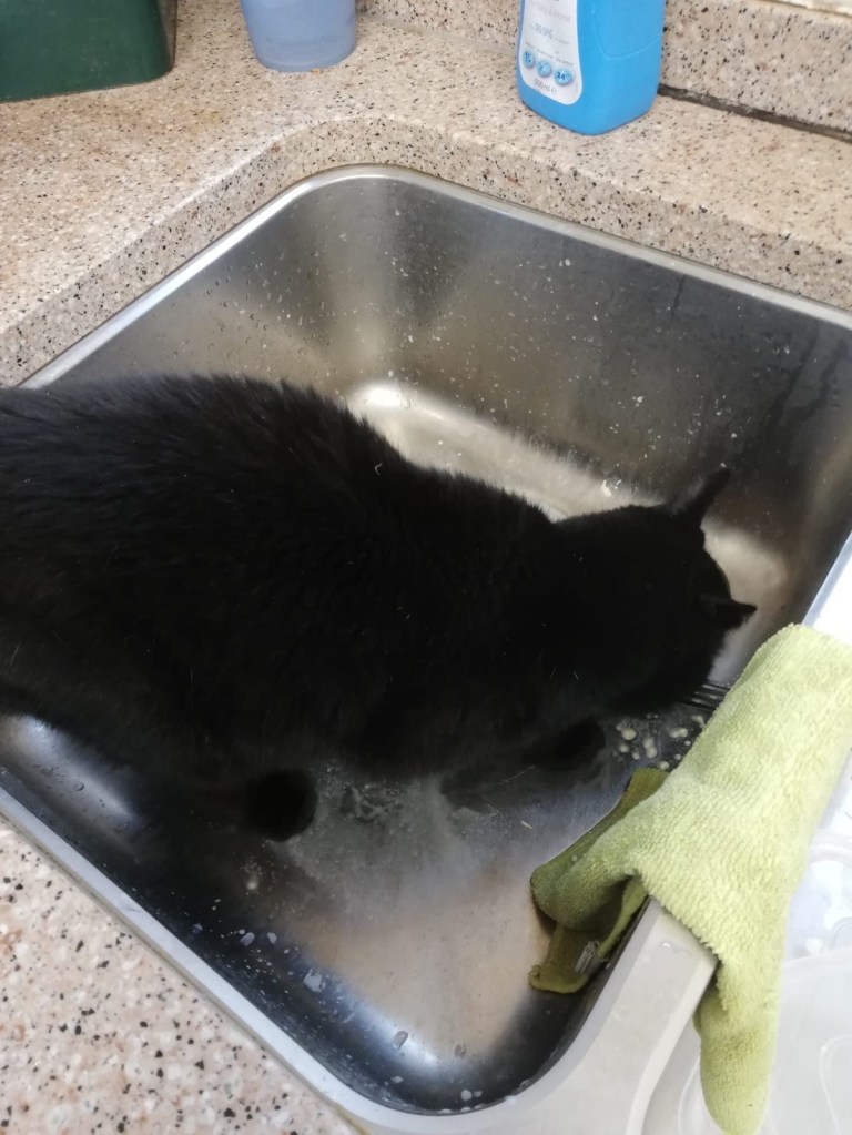 Quiet Mabel snuck up onto the counter to lick the butter knife and toast crumbs!!! Click below