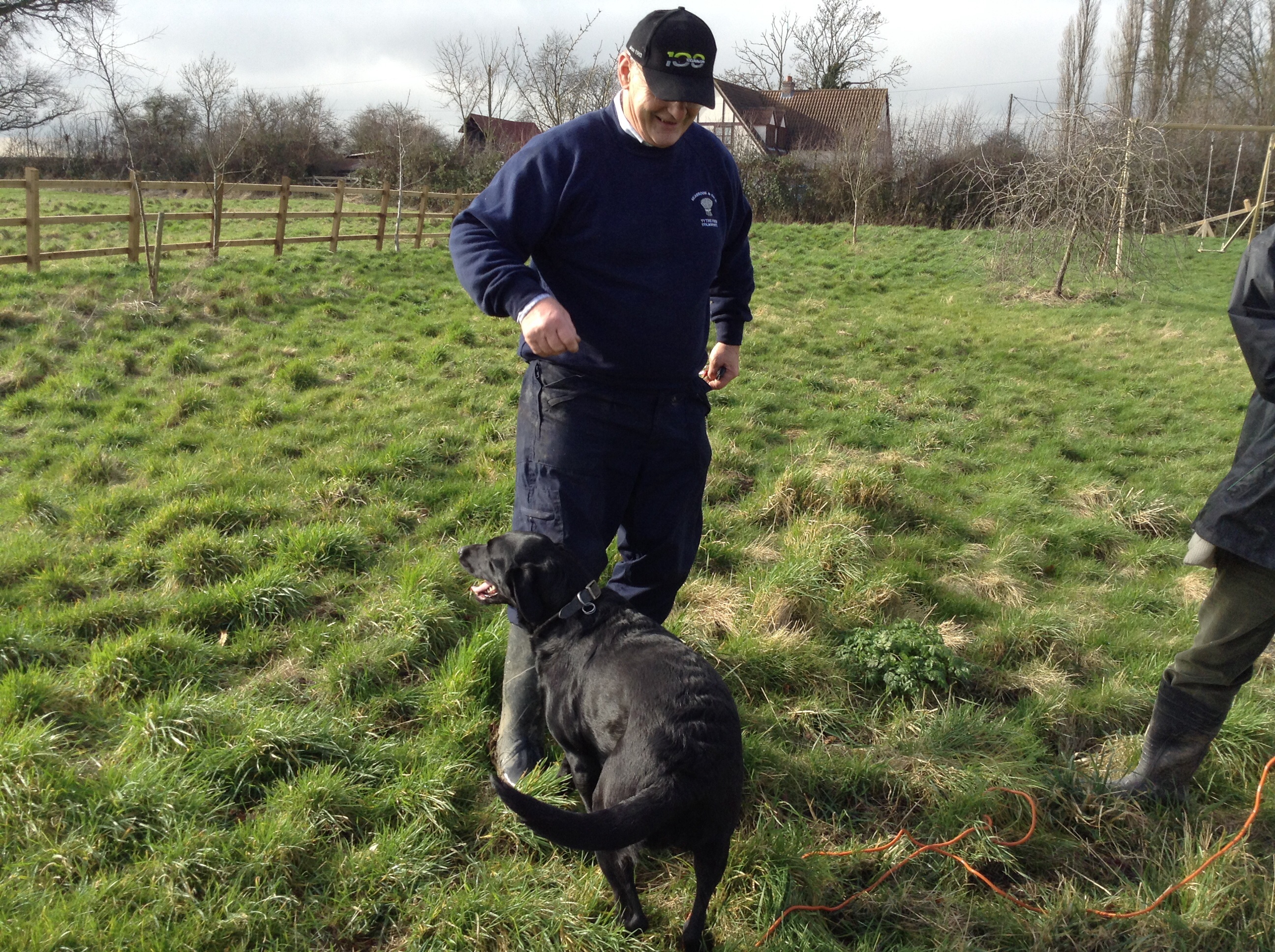 We thought she was a puppy and we searched for her name tag but, although there were loops in the collar, the metal disc was missing.  She had wandered into our yard wagging her tail and without an owner in sight.  Jeremy got a long length of rope, a bowl of water and a chocolate biscuit and I telephoned a neighbour to see if she knew to whom the dog belonged.  She had an idea and set off to make a call.  Meanwhile the dog was wagging her tail and enjoying the stroking of her silky black fur.  I went to the back door to find my address book and call another neighbour.  At the end of the field behind the house I saw a pick up van and a man in a cap pacing the boundary.  I walked towards him waving and shouting “have you lost a dog?”.