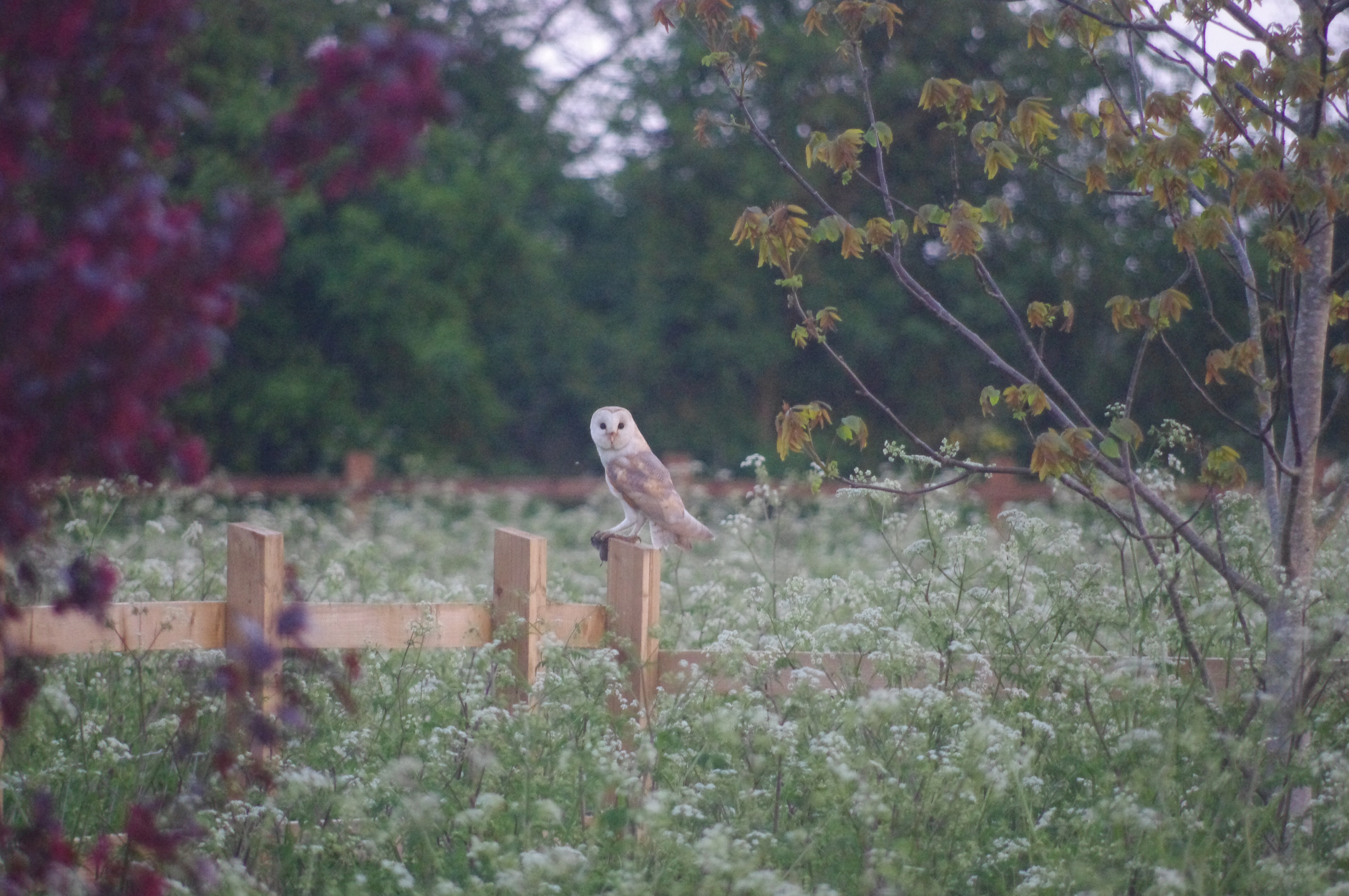 The owl returned at 7 pm and sat on the fence post. We saw him fly off around the field, very low to the ground. A few seconds later he returned to another fence nearer the house. He had a mouse ( or vole) under his claws and some blood on his beak. Clever owl!