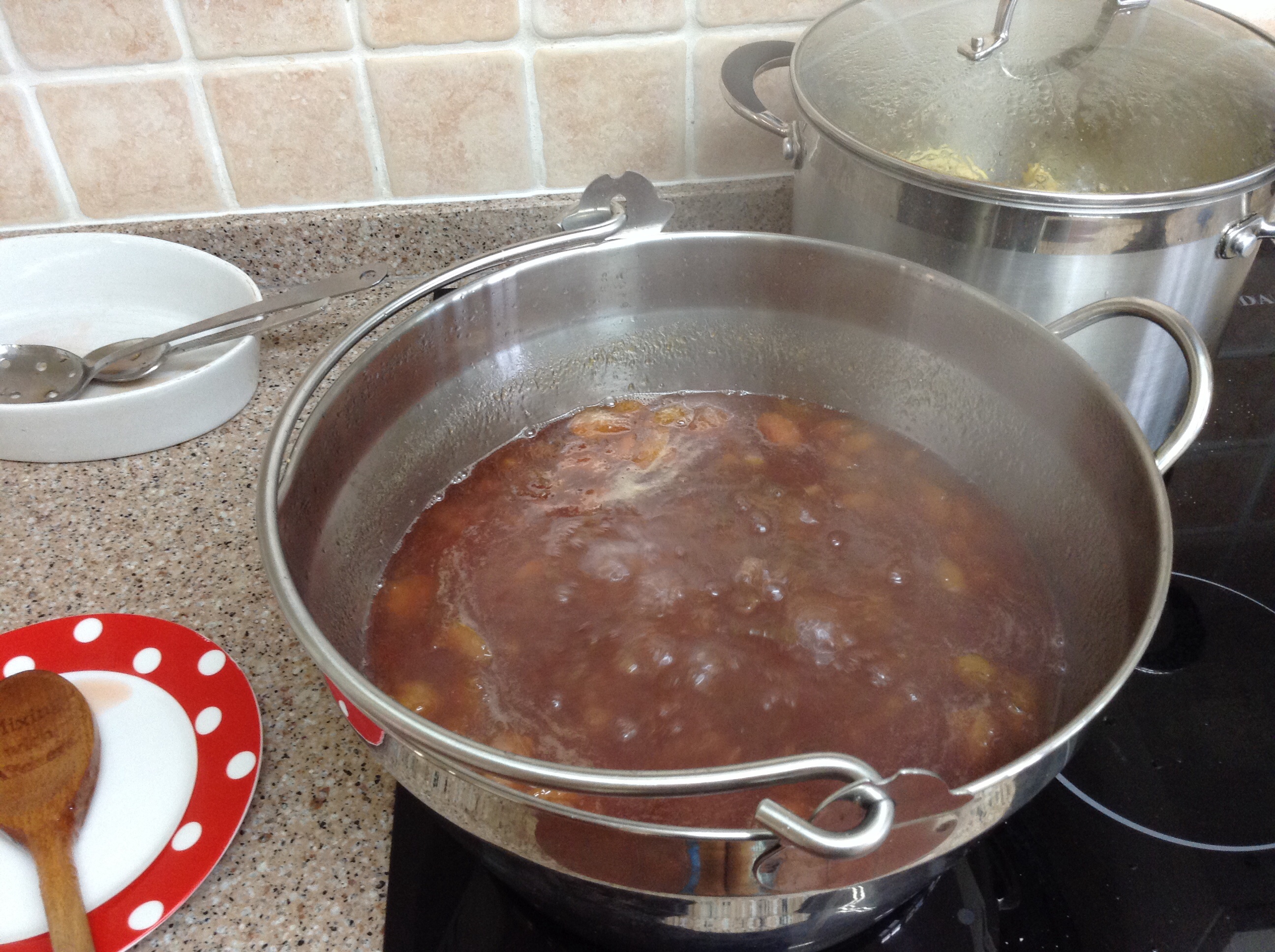 We stripped all the ripe Victoria plums from the tree in the orchard this morning and turned them into 12 pots of jam, a container of stewed fruit for the freezer and a compote of apples and plums to feed the expected guests visiting this coming week. There are four types of plum trees at The Gables. Damsons at the entrance, cherry plums in the back garden, Victorias in the orchard and a wild plum near the garages. All fruited early this year and made delicious jam.