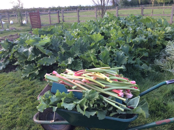 At 7.00 am we were outside pulling rhubarb from the far patch and filling a box to distribute to friends and family. jeremy pulled the stalks, I trimmed them and then put the leaves in the trench around the near rhubarb patch to suppress the weeds. Around The Gables (and with plenty of enriching winter cow manure) the rhubarb grows like Topsy. I will be making rhubarb crumble for our 30 guests next weekend.