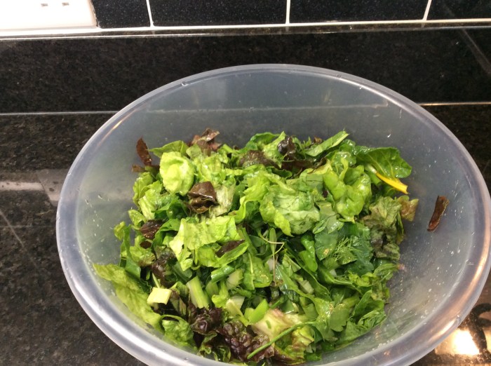 May 12, 2017 by gfreedman2013 Fresh , green, garden salad Two types of lettuce, spinach leaves, fennel, lovage, rocket, celery, Welsh onions, spring onions, mange tout, parsley and sorrel and all from the garden and the poly tunnel. Well done Jeremy and thank you. Share this: Share on X (Opens in new window) X Share on Facebook (Opens in new window) Facebook Like Loading... Related