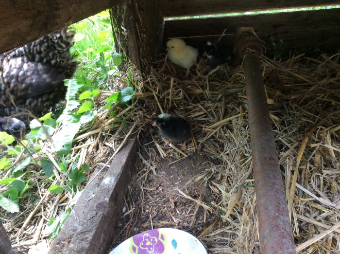I just went to the chicken run to given the hens and cockerels some corn. One of the sitting hens had gotten off of her nest and I felt sad that at such a late stage she had abandoned her eggs. How wrong I was. Without any fuss or bother she had six little chicks running around her. Clever hen. I gave them chick crumbs and a drown proof water drinker (an open bowl of water is an sure invitation for ducklings and chicks to fall in and drown) and praised mother for her calm approach to her brood.