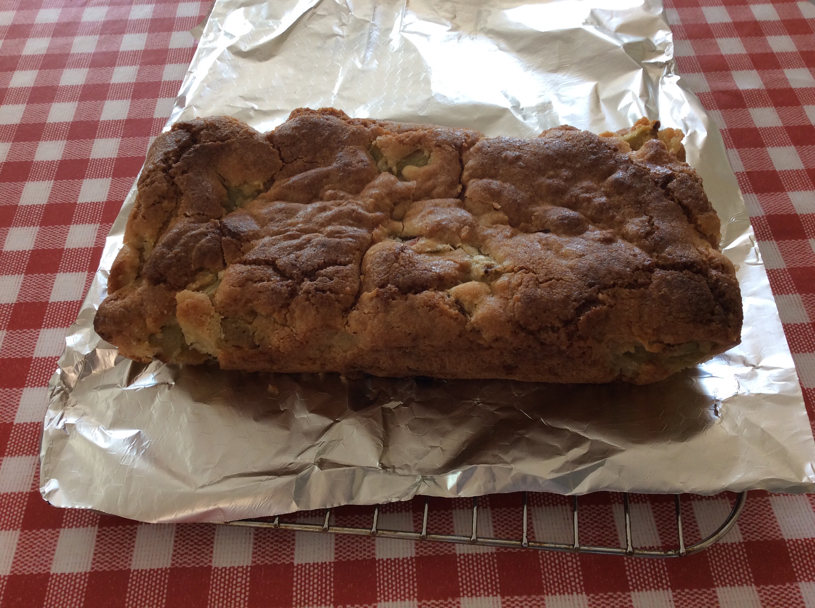 A couple of months ago I made a cake using sunflower oil instead of the usual butter. The ingredients were oil, sugar, flour, eggs(our own from extremely happy and cosseted hens) baking powder and chopped apples. It worked well and the tangy taste of the chopped cooking apples (from those we had stored) contrasted with the sweet sponge. Having run out of apples I decided to make the cake with chopped rhubarb today. It is just as delicious and we won’t run out of rhubarb until we harvest the apples in the late summer and autumn. It’s a matter of make do with what we have and adapt the recipes accordingly.