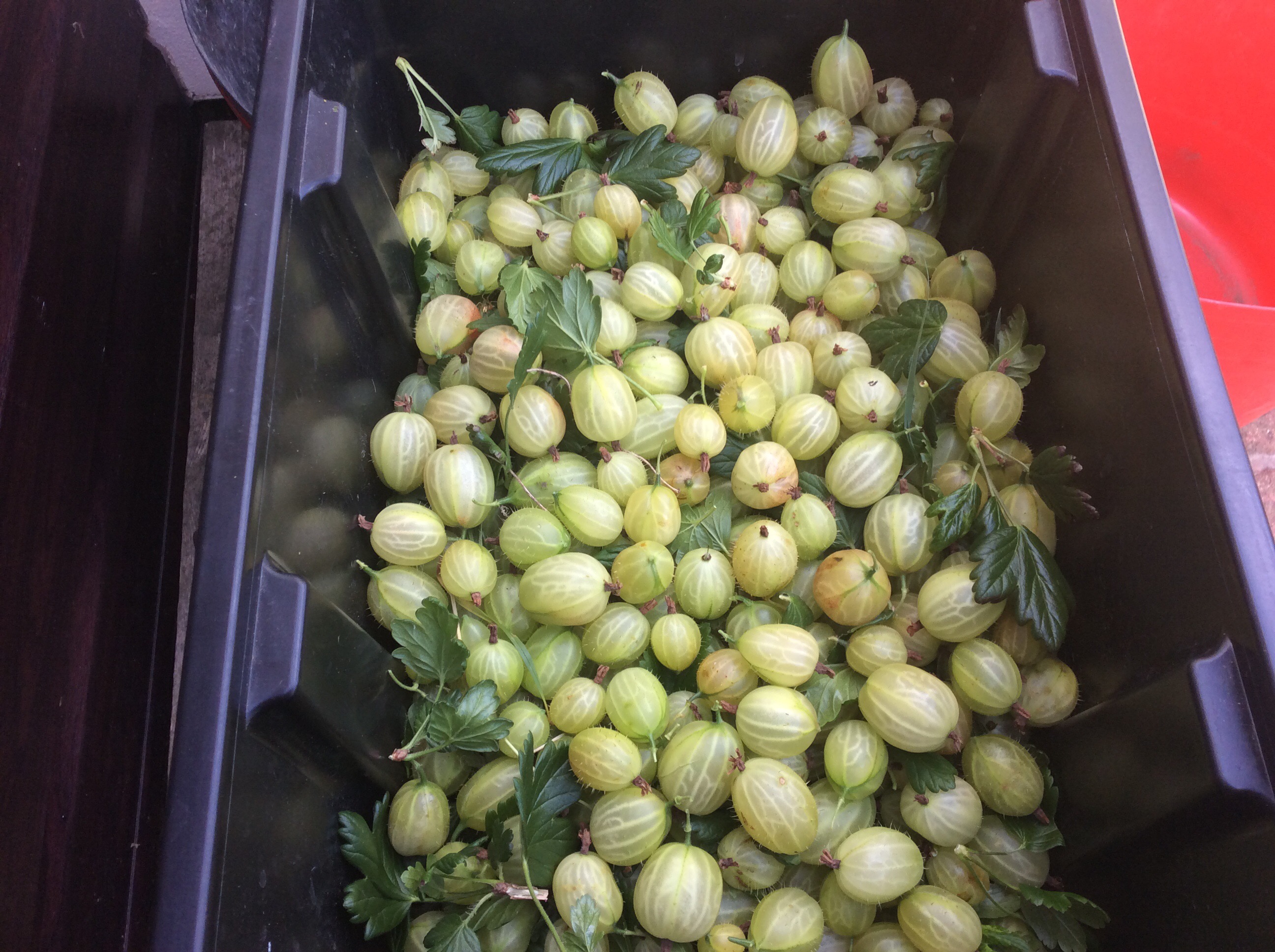 Is picking gooseberries.  The bushes are full of lethal spikes that attack fingers and any other part of the body that is not armour plated.  I picked a fraction of the fruit and this box yielded 9 lb in weight that I topped and tailed and froze in bags to be used at a later date – if I have any digits remaining!  My task this week is to pick some of the gooseberries each day and to get the asparagus bed well weeded.  And all around me I see soft fruits ripening – loganberries, blackcurrants, strawberries and even some raspberries.  Time for jam making and bottling.