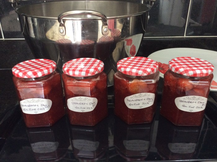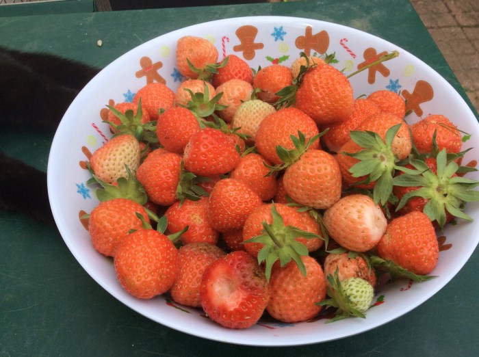This week I have set myself the task of getting the asparagus bed under control. There are dandelions and grass and nettles and creepers running riot but I am slowly unearthing the asparagus spears and at the far end of the area uncovering spreading strawberry plants. As I was pulling grass out of the strawbs I spotted a few ripe berries and, as I moved the plants aside, discovered more and more ripe fruits. So many that it was time to pick and make jam – a pleasant diversion from weeding and picking the lethal gooseberries.