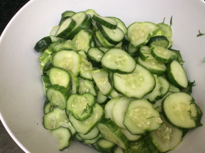 My current favourite salad is sliced, salted cucumber dressed with dill and a white vinegar and sugar mix.