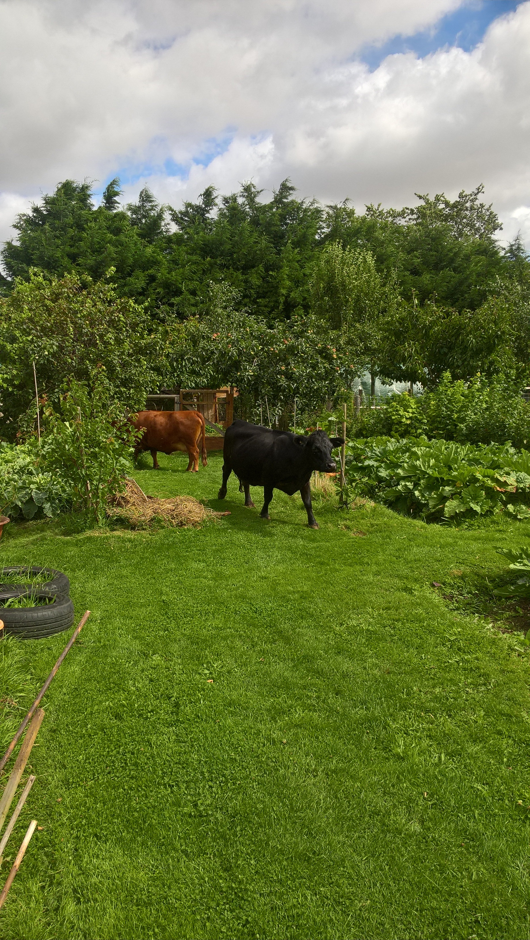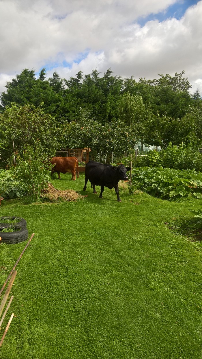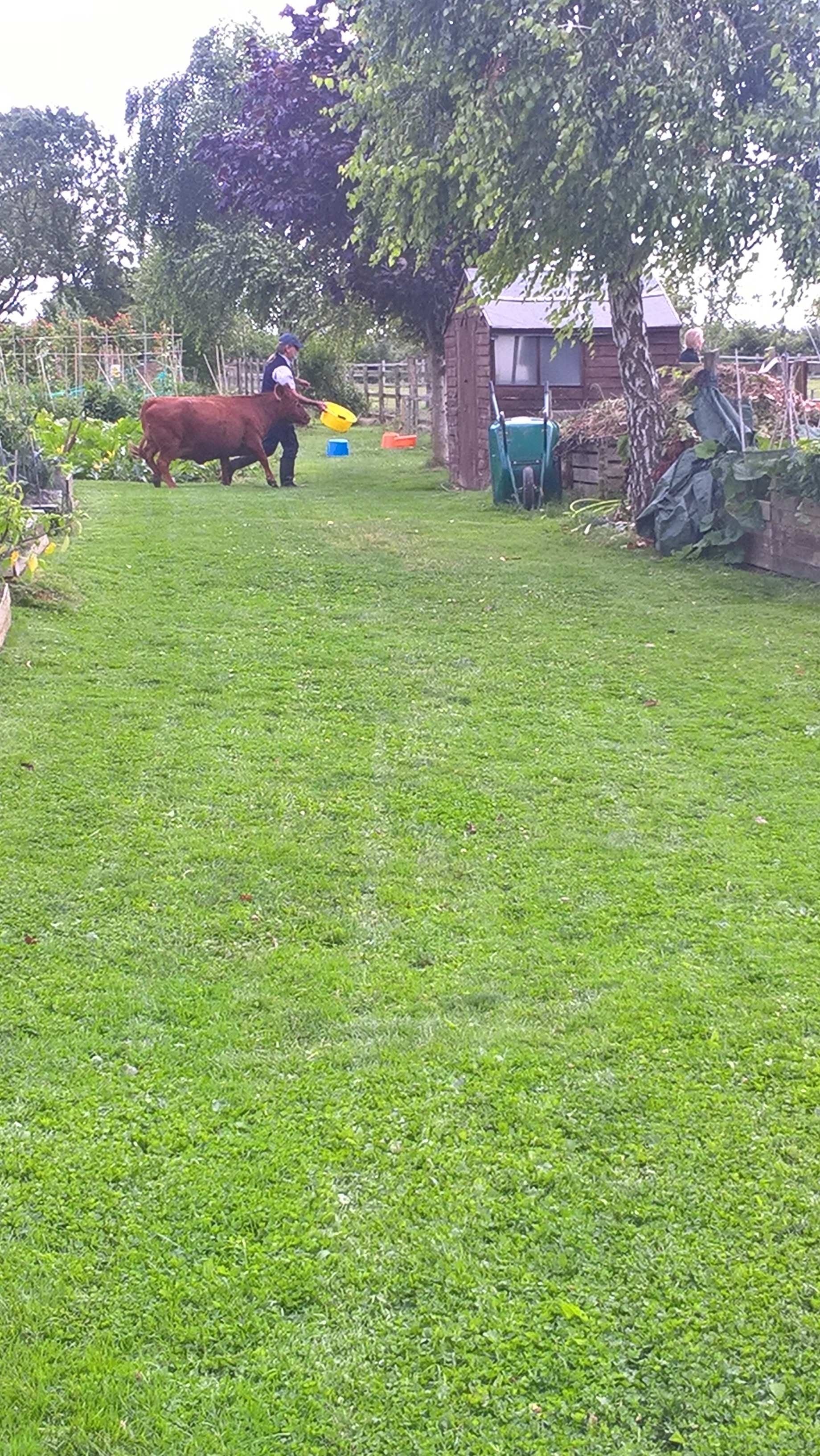 Jeremy, Phil and I borrowed Kate’s mobile fencing to catch the lambs and separate them from Tufty and the ewes. Five lambs allowed themselves to be caught very easily but the other four were playing “hard to get”. Five down and four to go and daughter, son in law and grandson arrived en route to Liverpool for a friend’s wedding. We were trying to catch sheep and they were calling out. “The cows are in the garden!” WHAT! Cows in the garden. Never mind the sheep, we all ran to the garden, buckets of cow food in hand and chased those naughty cattle out of the asparagus bed.