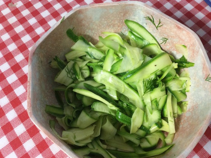 August 3, 2017 by gfreedman2013 Wafer thin strips of courgettes tossed in olive oil and lime juice with a twist of sea salt and black pepper. Dill instead of basil…why? Because Jeremy is in London today and I can’t find the basil plants! Share this: Share on X (Opens in new window) X Share on Facebook (Opens in new window) Facebook Like Loading... Related