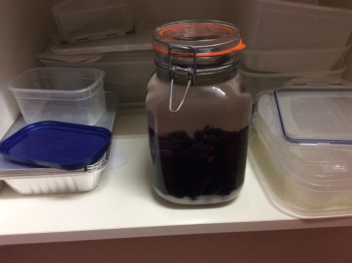 Yesterday we picked ripe sloes from the hedge in the paddock.  Today I washed and pricked them and put them into a large kilner jar to which I added sugar and a litre of gin.  The concoction will sit in a cupboard until midwinter and we have to remember to give it a shake regularly to dissolve the sugar.