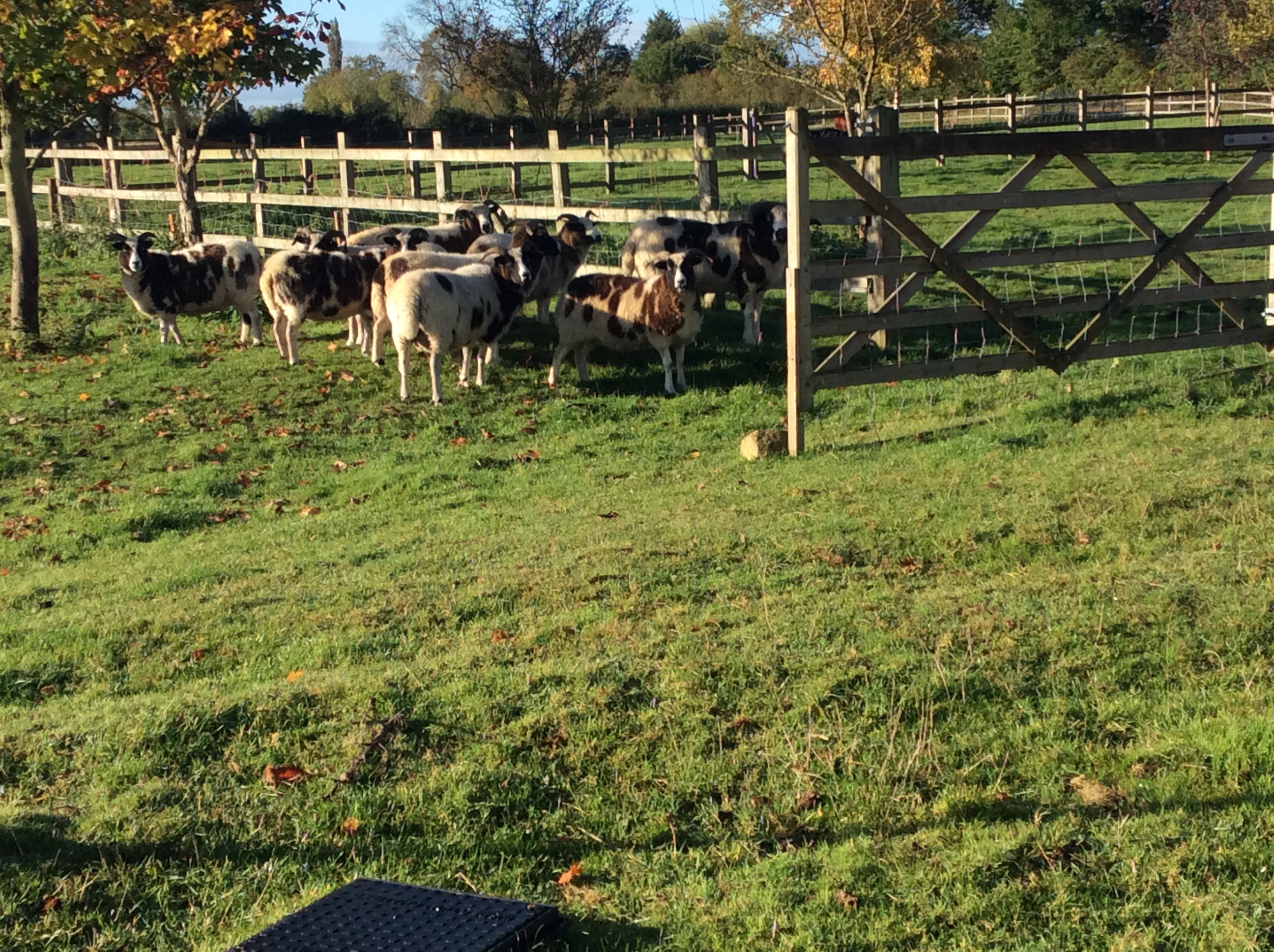 When I looked out of the bedroom window this morning the sun was shining, the ducks were quacking and all seemed peaceful at The Gables. Then, all of a sudden, the sheep were running from one part of the field to another (as if pursued by a bear, which they weren’t ). They settled down and yet a few minutes later they were following each other and running back into the paddock. I didn’t know why. I went outside to feed the hens and lo and behold 8 ewes and 1 ram were standing, sheepishly, in the front garden. I ran to the main gate to close it, afraid that the sheep would get onto the road and as I ran they turned tail and made for the side gate into the paddock, which was inexplicably wide open. This is the same gate through which the cows came into the garden a couple of weeks ago. There is either a mischievous garden elf opening the gate or the locking mechanism needs some attention!