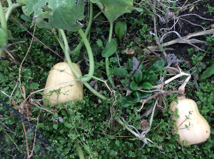 October 11, 2017 by gfreedman2013 Worth the wait The butternut squashes are ripe and ready to harvest. We don’t have as many as last year so it will be a difficult decision….do I roast them with red onions and garlic or turn them into soup? Share this: Share on X (Opens in new window) X Share on Facebook (Opens in new window) Facebook Like Loading... Related