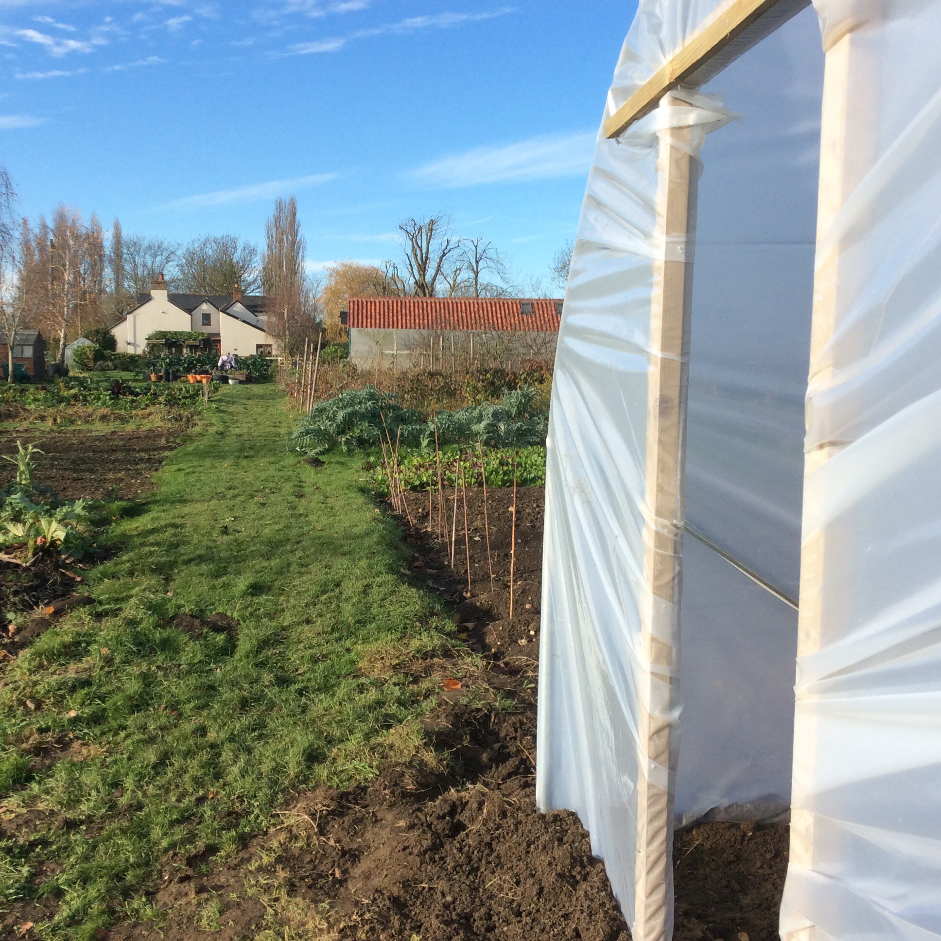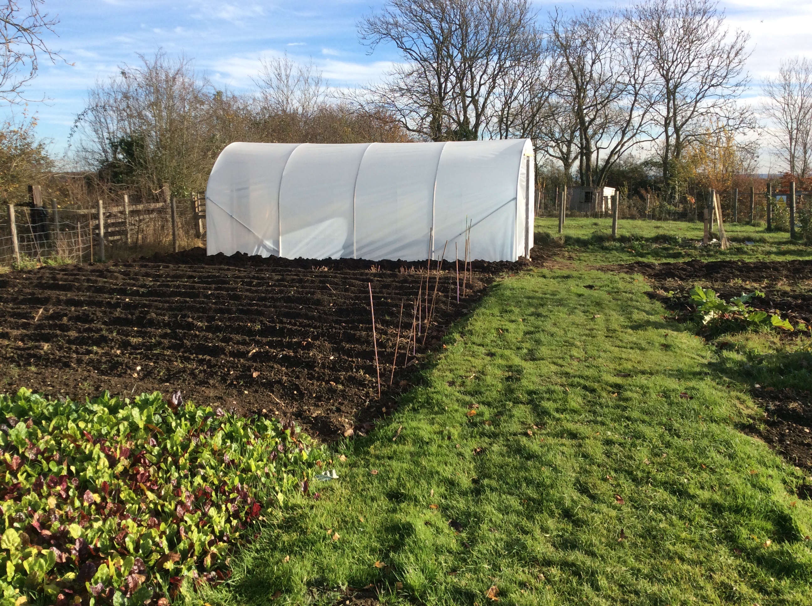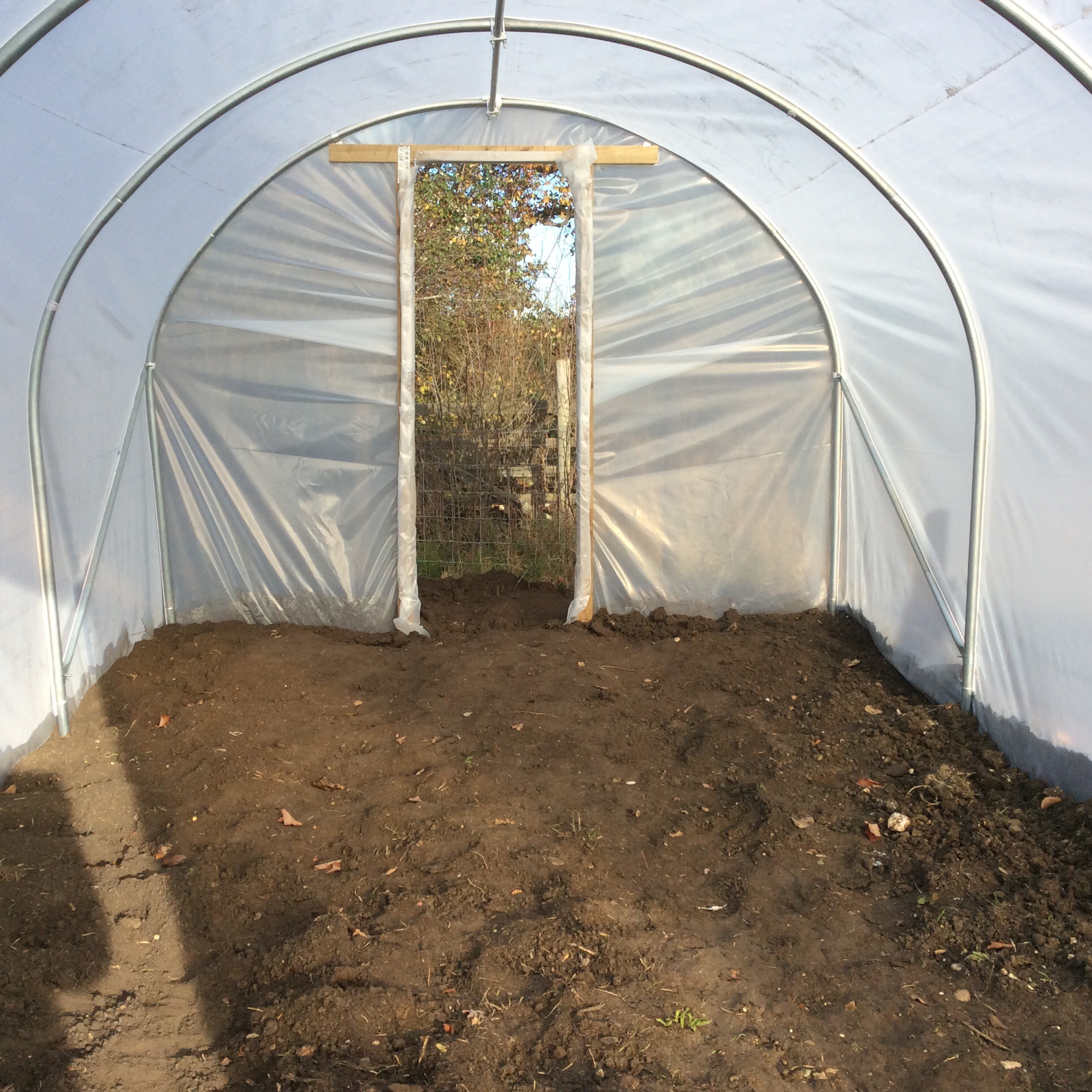 The new polytunnel went up two weeks ago and, when the wind died down and the sun shone, four of us put the polythene cover over the frame yesterday morning. It looks splendid even minus its two doors. Should be ready for planting very soon.