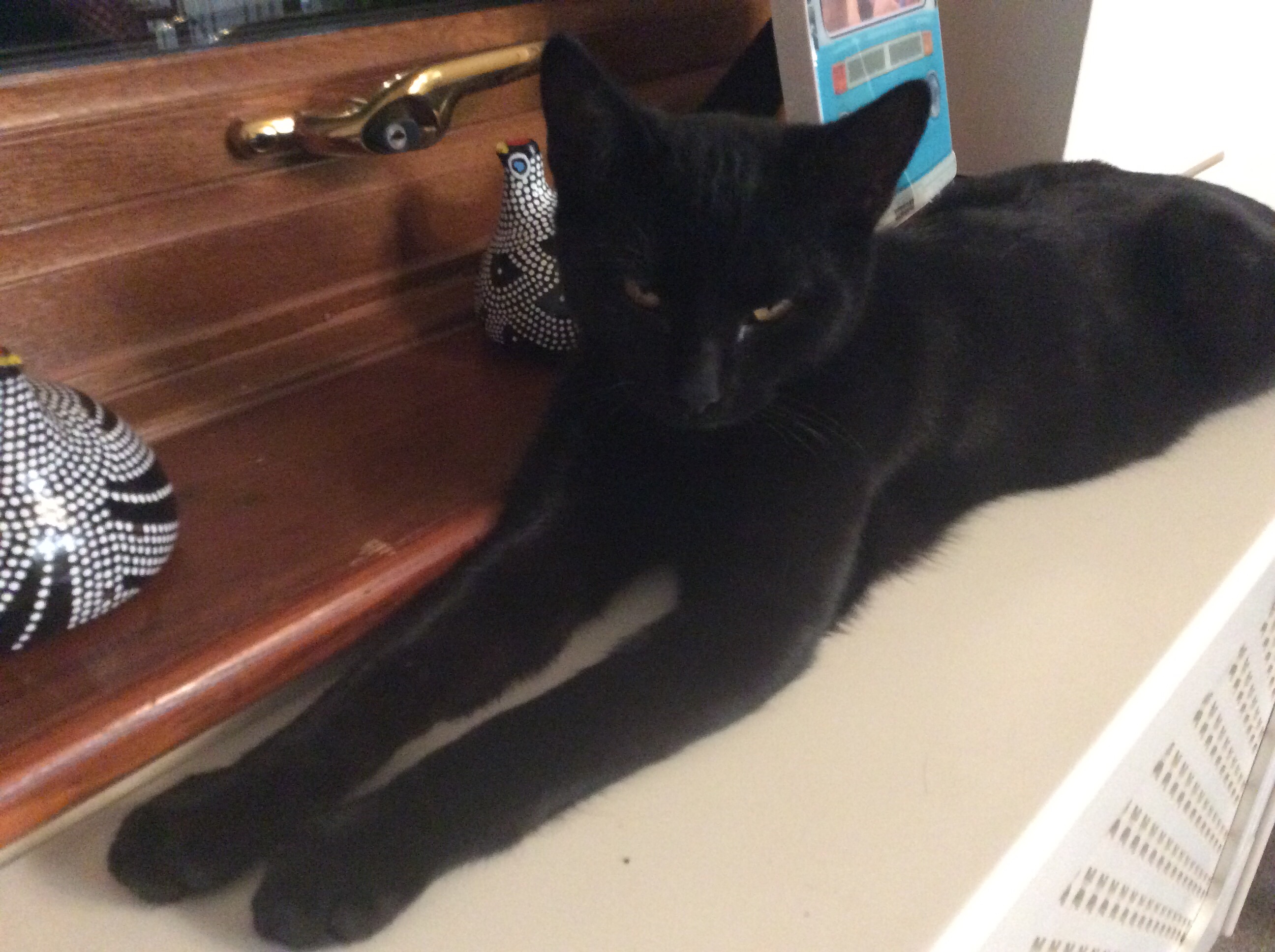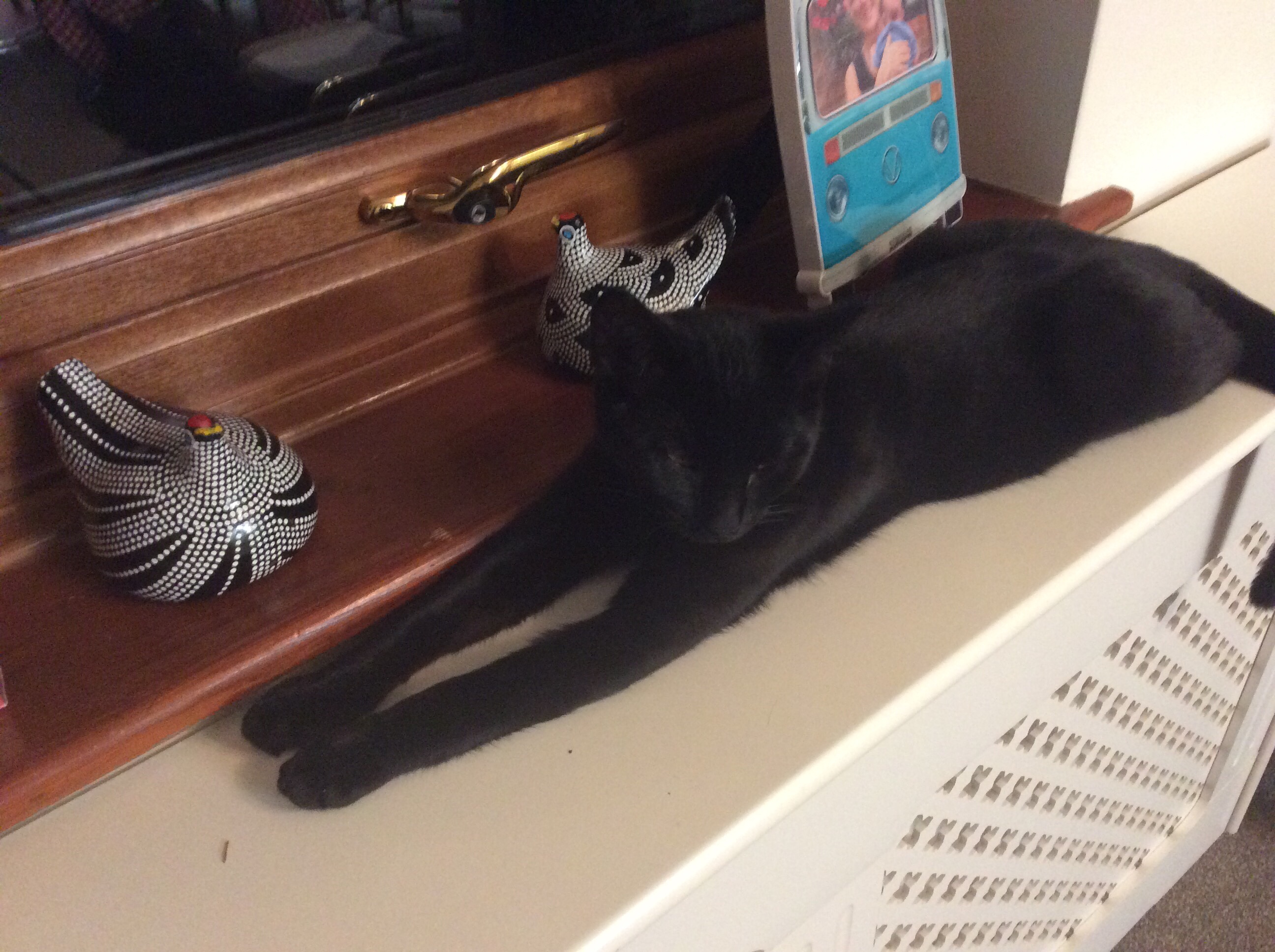 £50 lighter we returned from the vet with some probiotic liquid and a syringe, ten pouches of chicken and rice for sensitive stomachs (cats not ours) and a kitten full of fun and energy again. He made himself at home in the surgery and managed to lift up the lid of their “treat box”and help himself to a doggie bone shaped biscuit!
