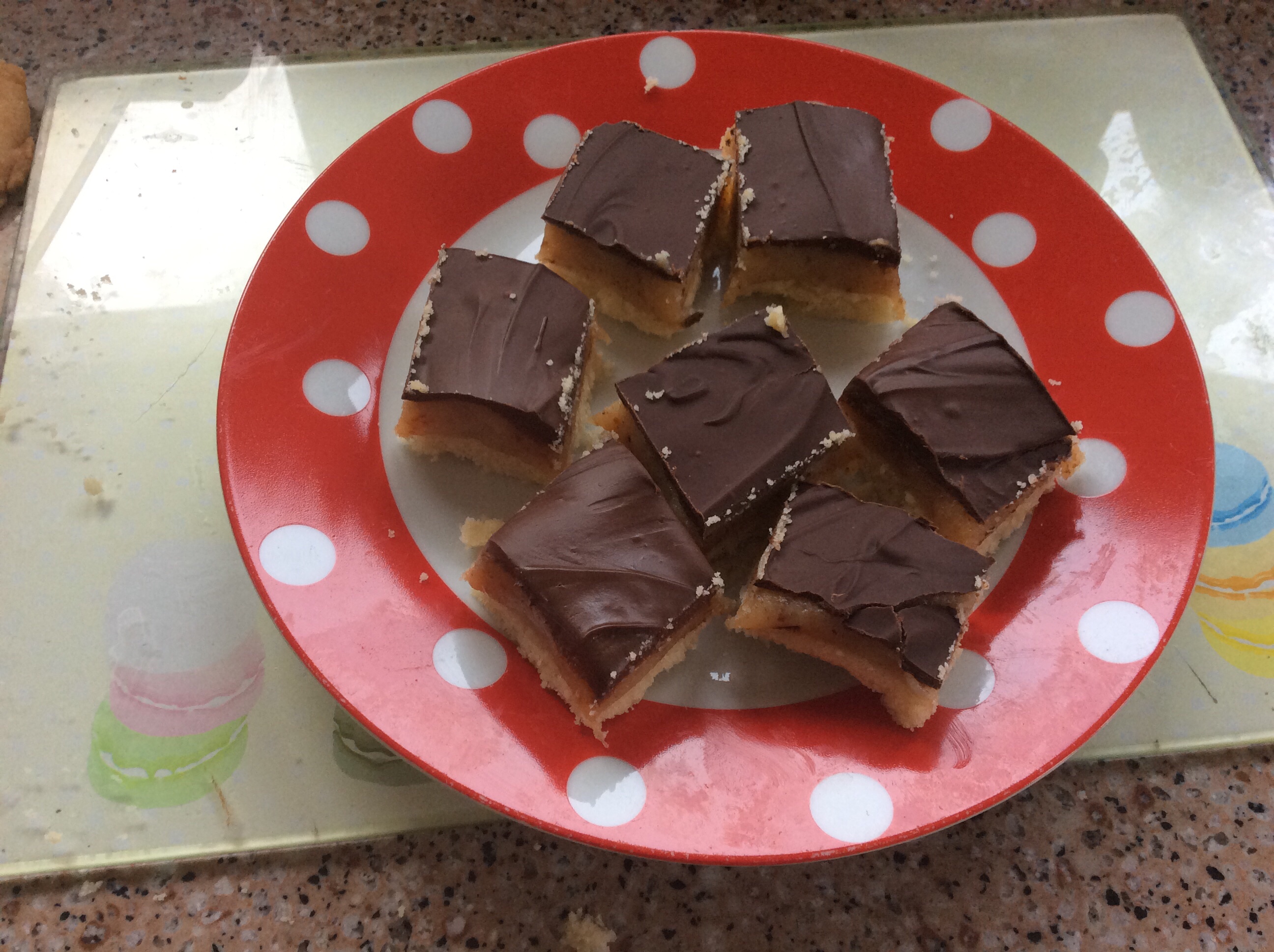 Butter shortbread base then a layer of caramel and topped with melted chocolate. Leave to set, cut and eat with a cup of tea or coffee.