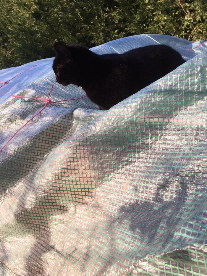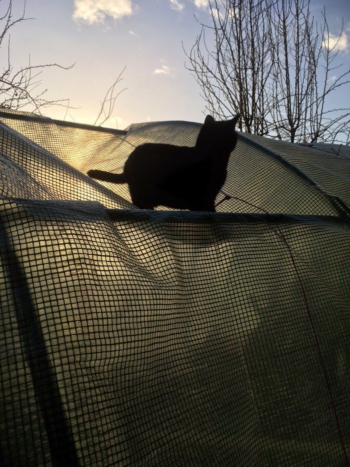 And Mabel decided to climb onto the roof of the green polytunnel – where most of the chickens live – just as I was trying to tie down the polythene roof that had been partially blown off its frame during the early morning wind.