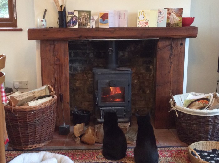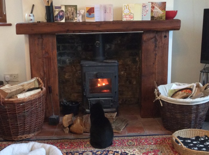 Sitting by the fire. Sadly Nigel had to be banished during breakfast as he tries to jump onto the table and eat our food. He was allowed in after Jeremy had cleared up but then was sent out again for jumping into the kitchen sink!