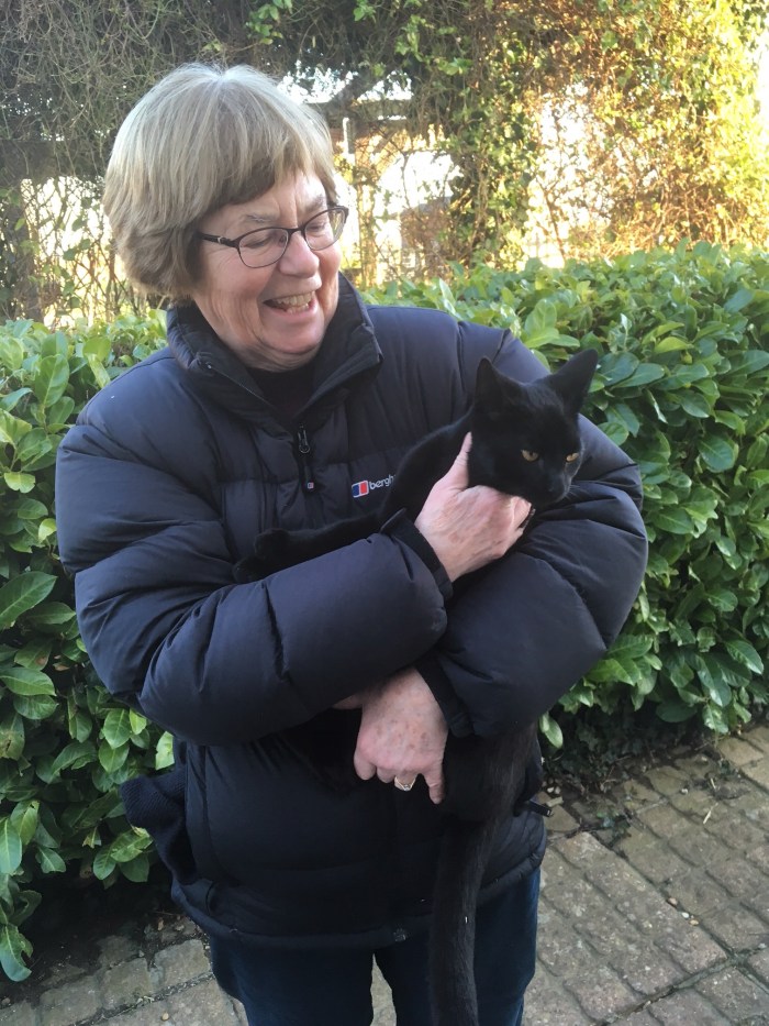 My dear friend and walking partner of the last three years and, hopefully, of the future walked over this afternoon to check on my progress. She was delighted to see Nigel as it was she and her husband who found the cat when he appeared in their yard some months ago and cried and cried and wouldn’t leave. She noticed how much he has grown and they had a lovely cuddle.