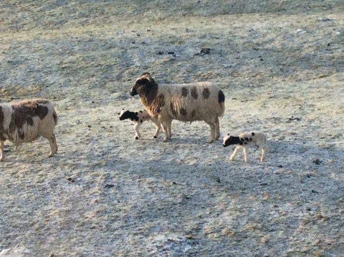 We shall have to keep a close eye on the lambs because as they grow one is often pushed aside by the two stronger siblings. Mother can only feed two at a time so we may well have to bottle feed the runt. Let’s wait and see and hope. Two more ewes left to lamb.