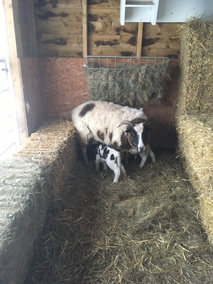 and Cieste and her triplets and Little Miss Pretty and her twins are in one half of the cow barn. The two mothers have a wall of hay and straw bales dividing them so each had their own space.