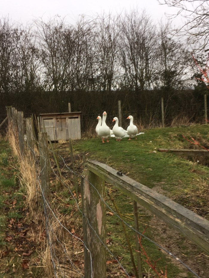 Their wings clipped, they are now living at the goose pond. We locked them up for the night with plenty of food and water. Not sure how well the geese will like sharing their space when we let them out in the morning. Two drakes remain with 8 ducks at the duck pond and one duck has been sitting on a nest for a week.
