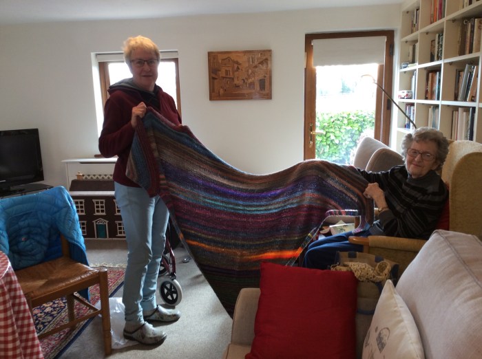 To see Mum and me and to show us her latest knitting creations, which are gorgeous. While she was here I took her to see the lambs and she helped me give them their afternoon feed and also helped me to put hay in the barn for the cows.