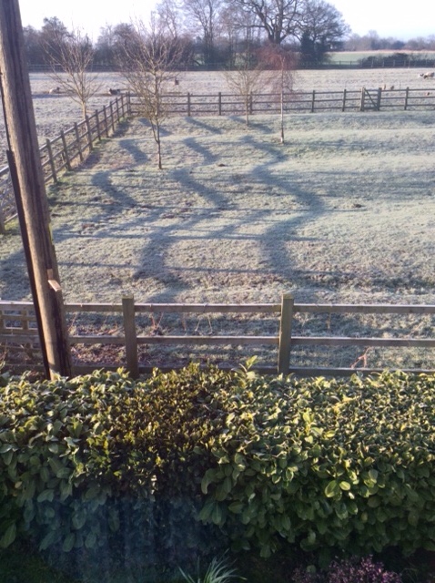 And Jeremy took this photograph at 7.00 am. The sun was shining on the wooden fencing and the shadow formed a zig zag pattern in the paddock because of the lie of the land……the ancient ridges and furrows that we are privileged to retain on our small patch of land.