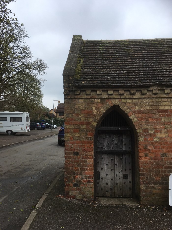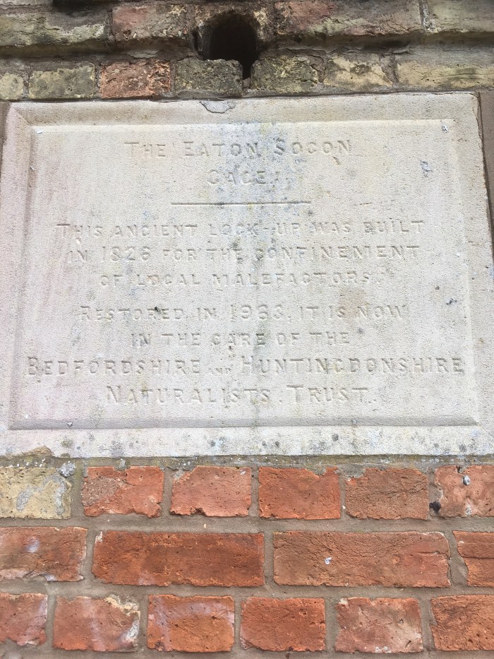 Instead of sitting in reception at Wilson’s garage, waiting for my leaky tyre to be repaired, I took my daily constitutional in Eaton Socon. Just off the main thoroughfare I found a wealth of hidden treasures and even objects on the ground. First was a small gatehouse erected in 1828 for”malefactors”!