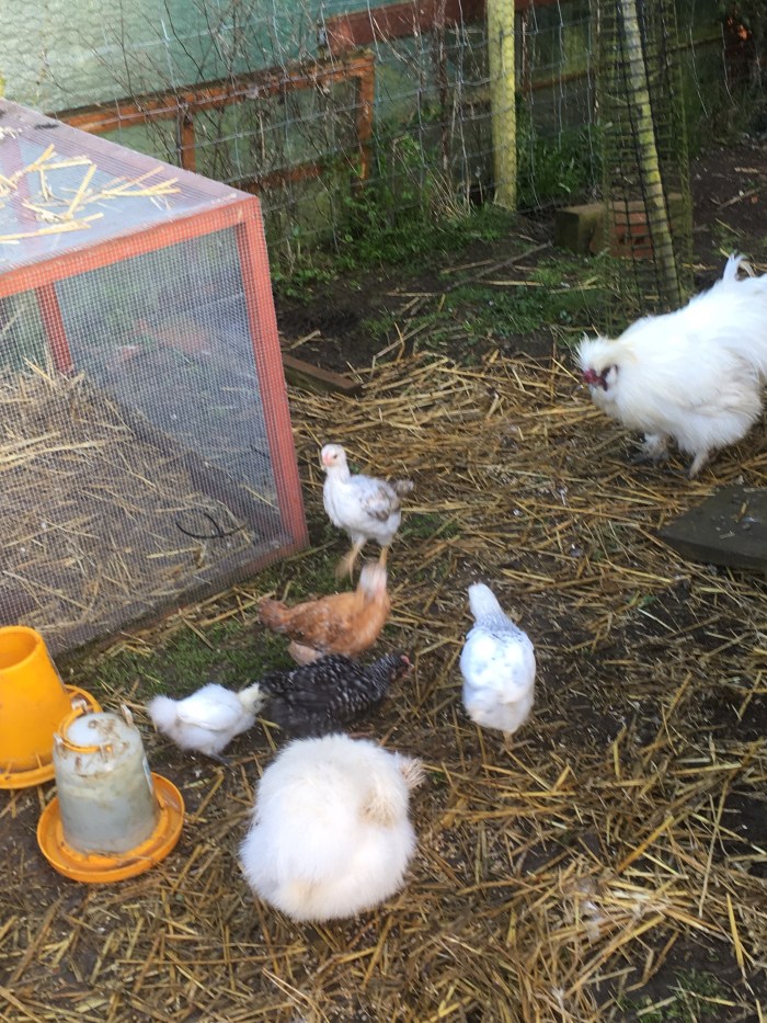 Mrs Silkie and her five chicks sleep separately from Mr Silk but during the past few days they have spent time together. The chicks are a bit wary of the cockerel but so far all is well.