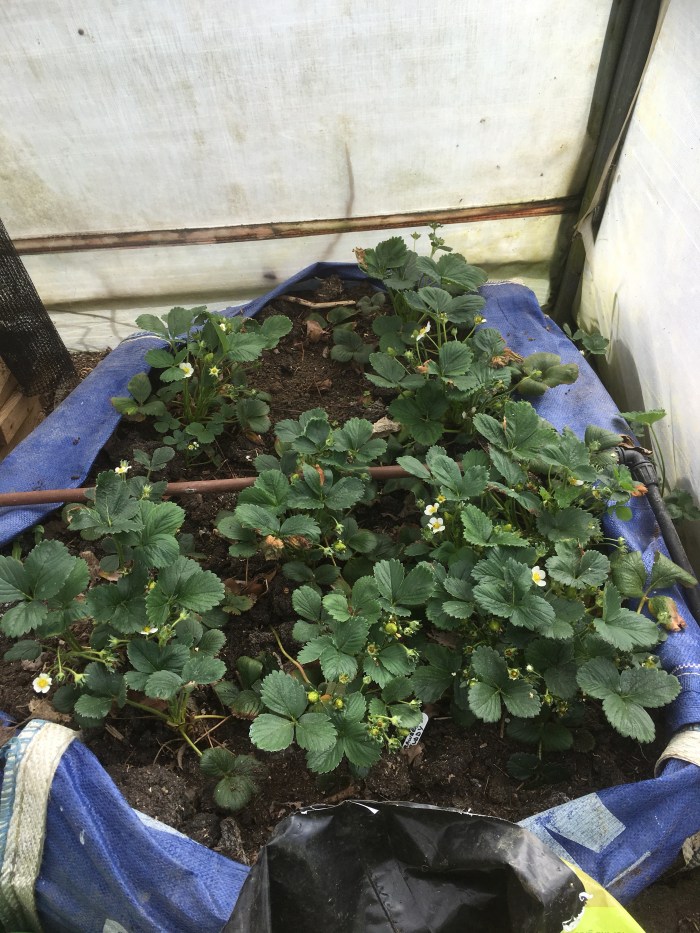The strawberries have flowered and are forming berries