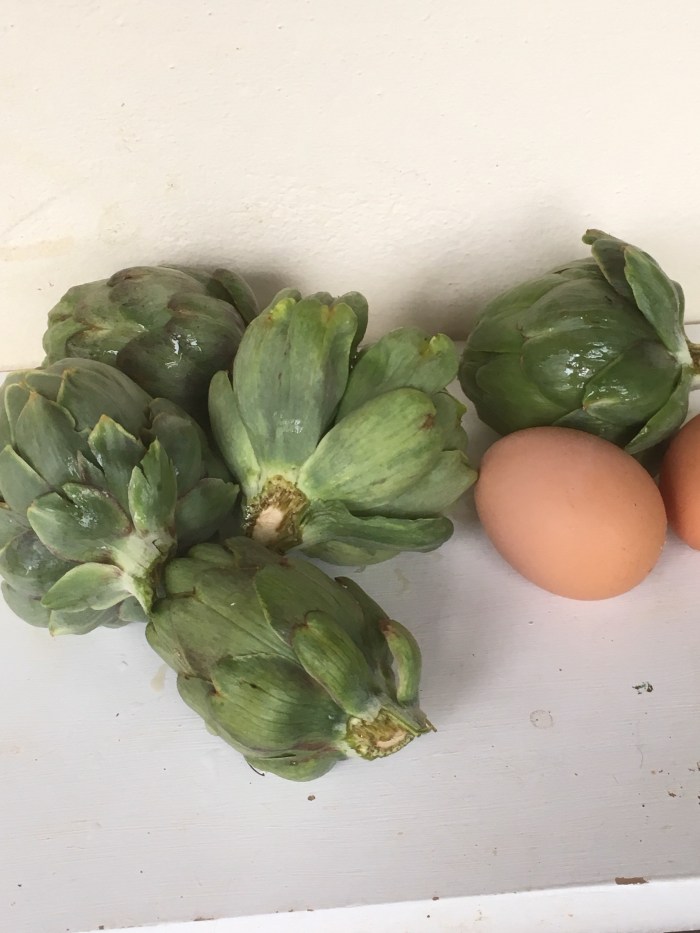 I picked the first artichokes this morning just after I collected two warm, brown eggs from the hen house.