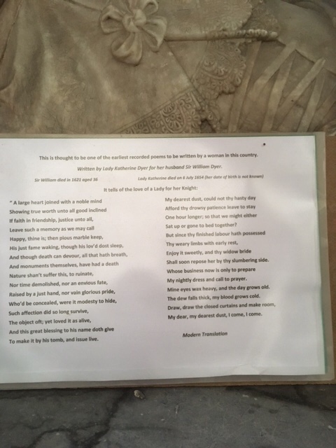 As we walked we discussed the Lady Katharine Dyer monument inside St Denys Church, Colmworth. On the Sir William Dyer’s tomb is inscribed the epitaph to her husband that the young widow wrote in 1641. It is the first documented poem by and English woman. This is a typed version below.