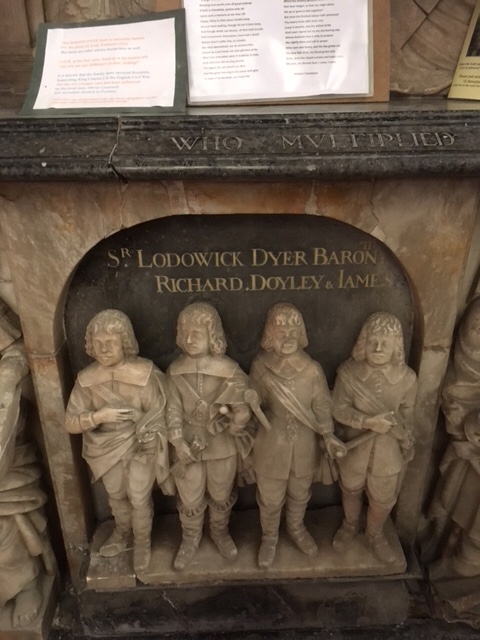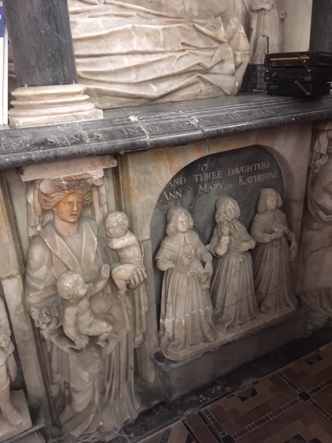 Also on the monument there are reliefs of seven of the Dyer children, four grown up sons and three grown up daughters. Lady Dyer is shown holding her two babes in arms. The three girls are crying.
