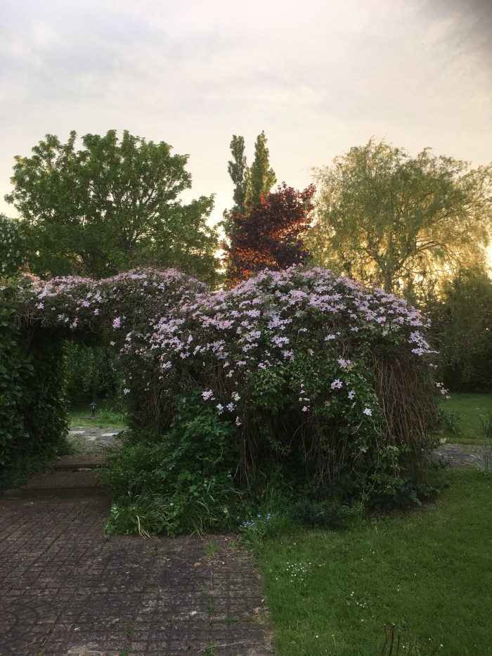 And the clematis is opening in all its glory