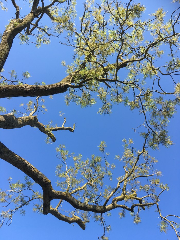 Pictured as I lay on the grass looking up through its branches to the blue sky
