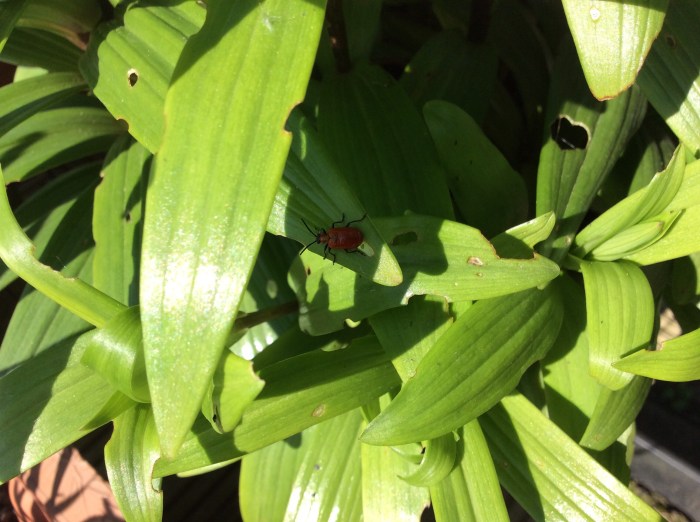 They only live and lay their eggs on lilies and other fritillaries and they also eat holes in the leaves. I only noticed them yesterday and had never seen them before. Pretty but destructive.