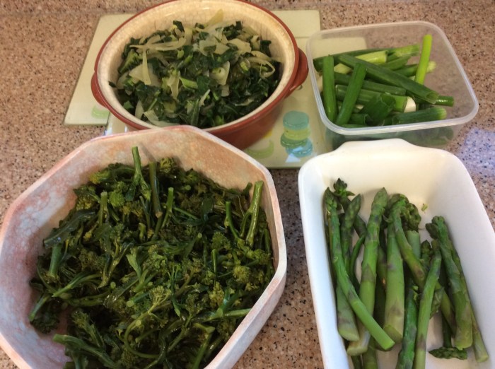 Cabbage and onion, purple sprouting broccoli, asparagus and green onions