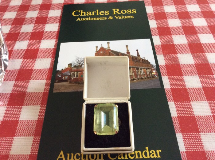 The green ring has sat in my jewellery box for many years alongside earrings made in China and knickknacks picked up at jumble sales and charity shops. I suppose I always thought that it was valuable but I never found occasion to wear the jewel. Last week I read an advert in the local Bedfordshire newspaper announcing jewellery and antique valuations today in Cople, a village a few miles away. I decided to take grandma’s ring and jade earrings to be valued. It was a pleasant drive through lush, green countryside and, when I parked at The Barn, a gentleman directed me to the jewellery expert sitting under a small awning. She examined the ring with her eyeglass.