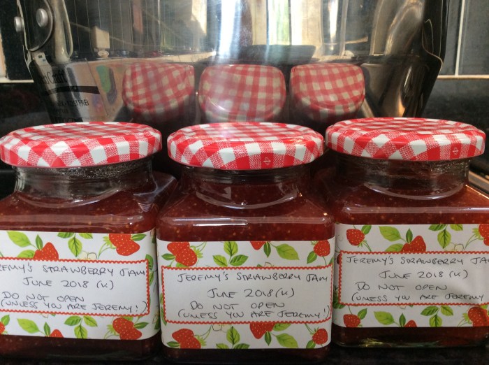 In the autumn we grubbed up a number of worn out strawberry plants. Although we have planted new ones the crop will be smaller this year. As strawberry jam is Jeremy’s favourite preserve, I have just put the following warning on the three precious jars made this afternoon.