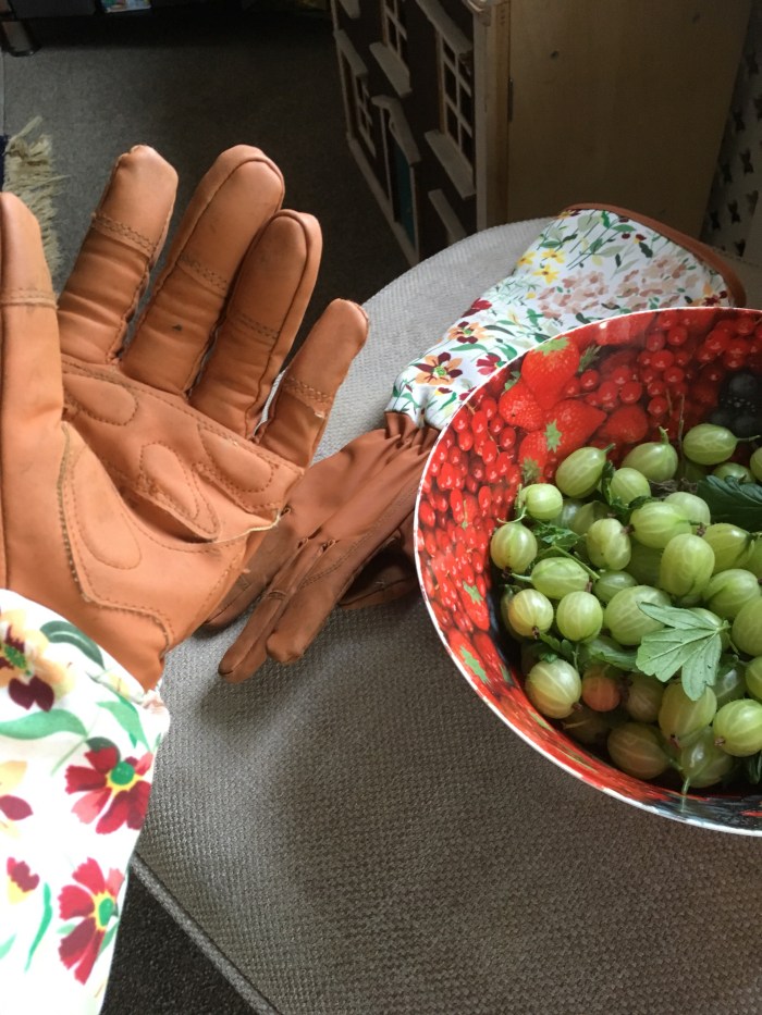 This year I order a pair of leather ( non vegan!) gauntlets and they arrived last week. I tested them on the nettles and spent days pulling out the stinging plants. My gloves protected me to the detriment of the nettles. Yesterday I picked a bowlful of gooseberries without any injury. Hooray!