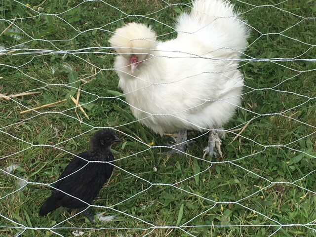A few weeks ago we gave our friend some eggs to put under her broody Silkie. Only one hatched and The white hen has a black baby. Both very cute.