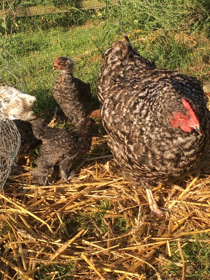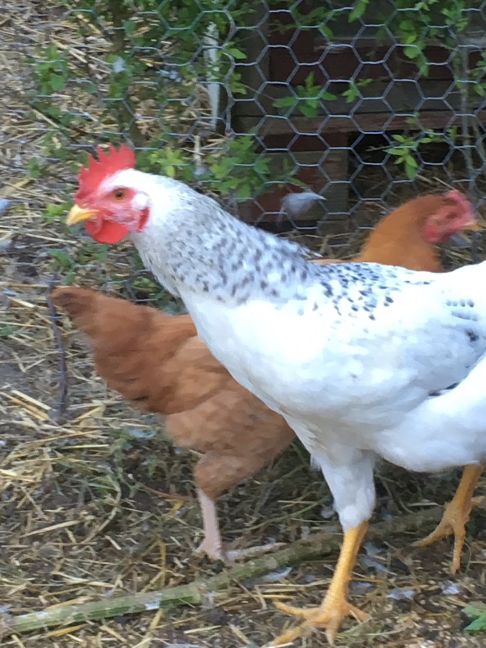 Of the adolescent hens, hatched about three months ago, two are boys and two are girls. One cockerel is a caricature specimen with a red comb and a yellow beak.