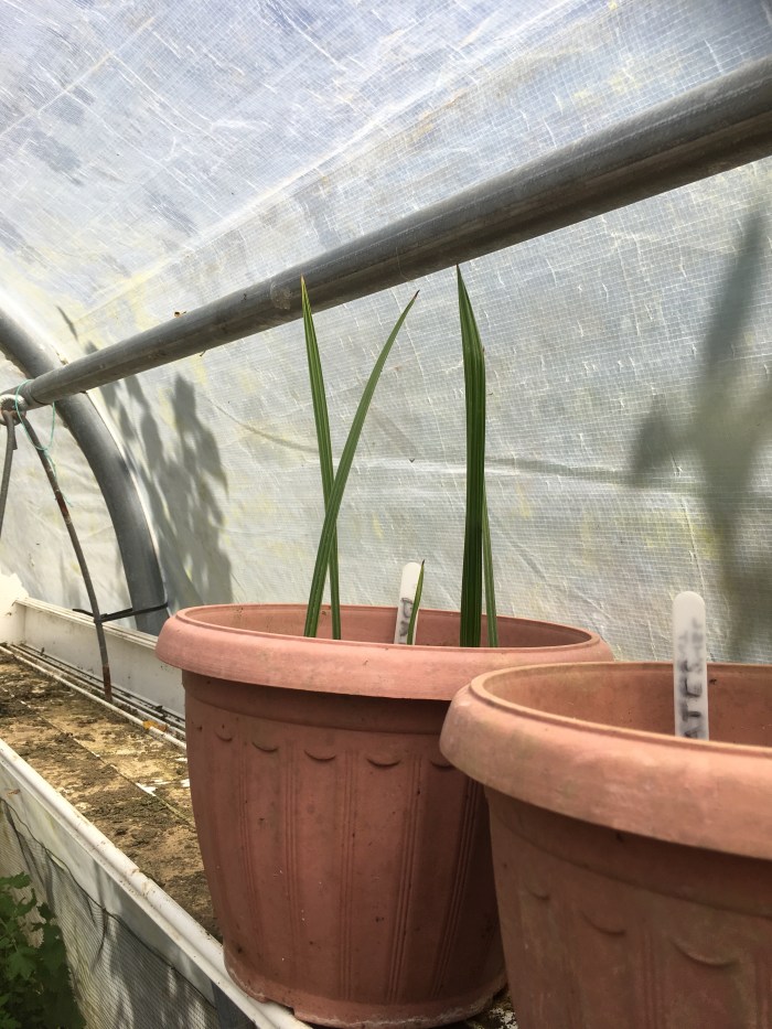 Dates (one of the seven species described in Deuteronomy which grow the in the Holy Land). Grown from date pits and doing well in the poly tunnel.
