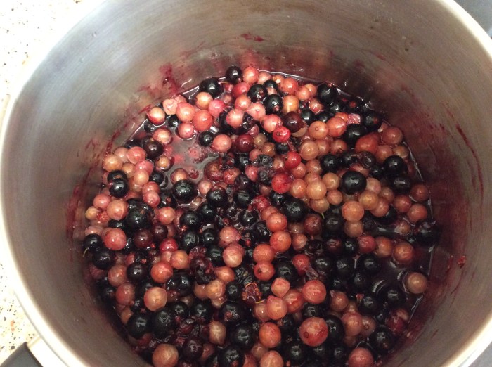 I went down the garden to pick the pink currants but on the way I found an unexpected last crop of blackcurrants. I picked and sorted them and then added the pink currants that I had washed and prepared.