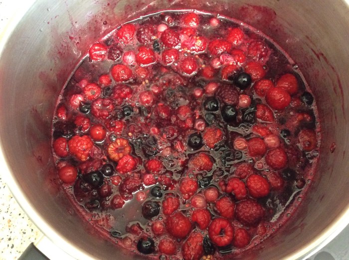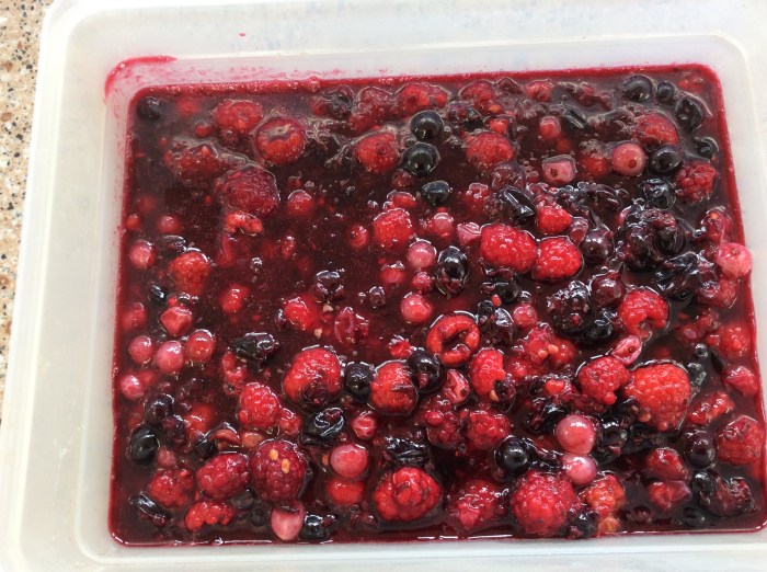 Then I picked some raspberries and added them to the slowly and lightly simmering currants. They cooked for a minute or two and now they are boxed up and ready for the freezer.