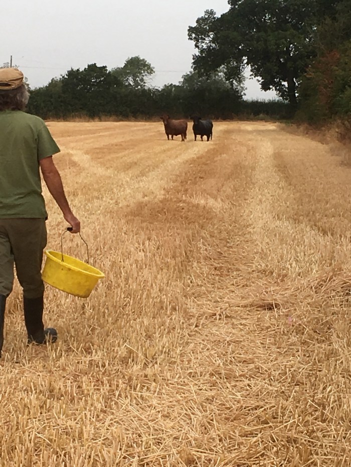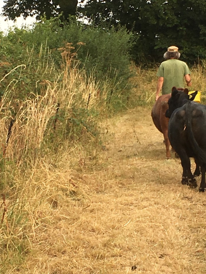 Up we got, pulled on our clothes, grabbed an iPhone (me) and two buckets full of cow concentrates. Then it was off across our field to the hedge on the far side and into the next door field where (around the corner) we spied two naughty cows.