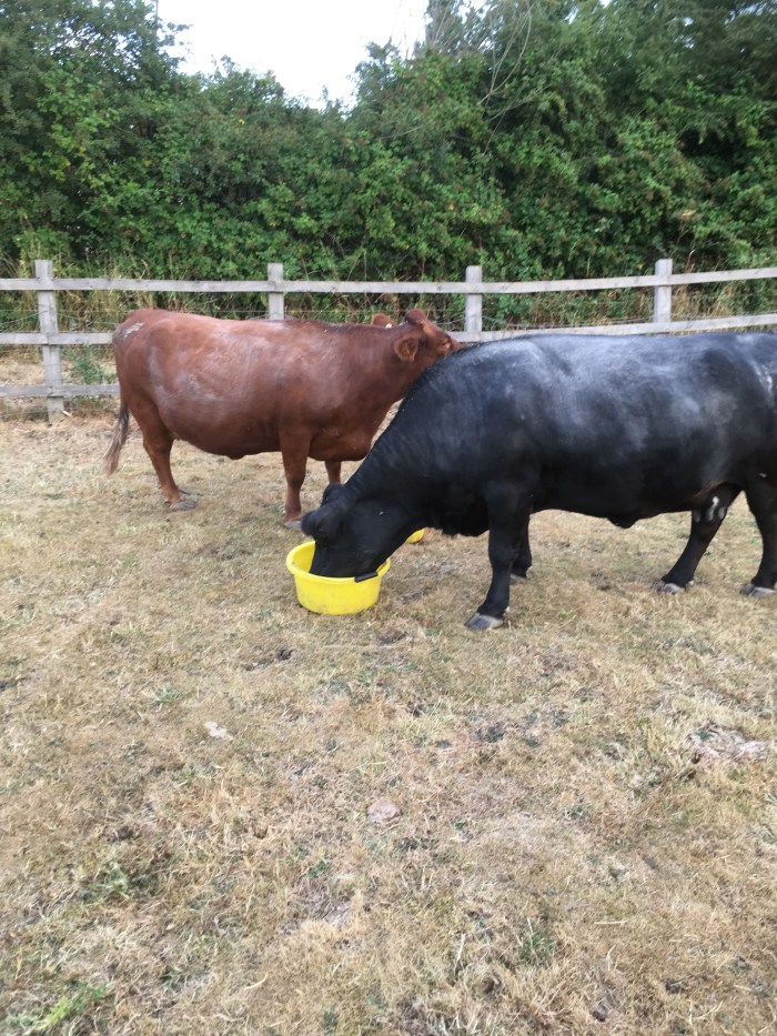 To mix my metaphors, the Cows looked a little Sheepish! Slaves to their stomachs, they trotted towards us and the food buckets.