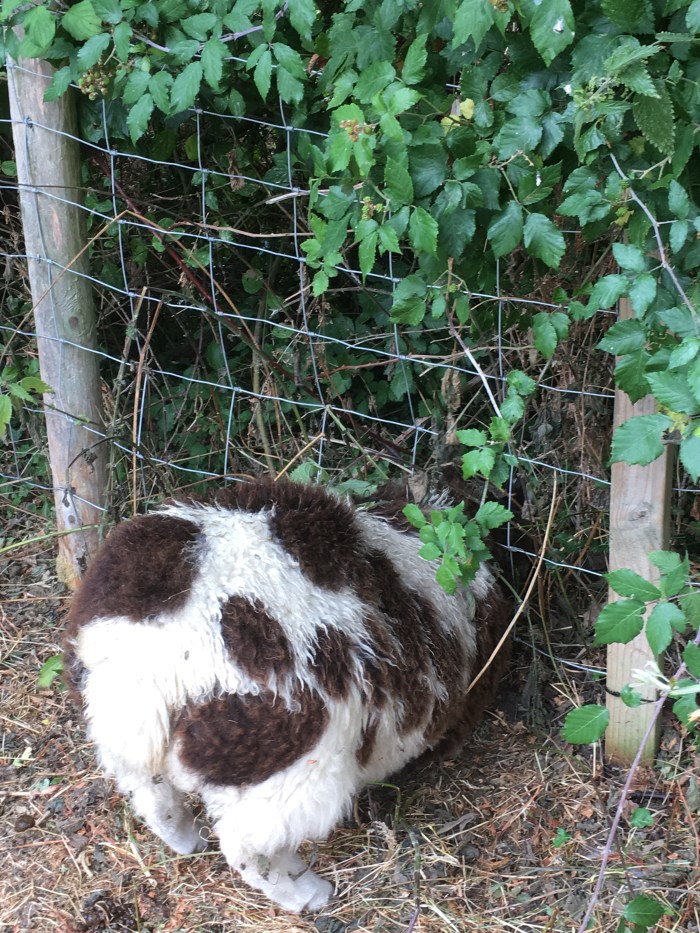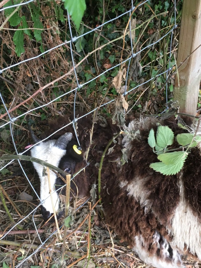 One of the two girl lambs in the paddock has a habit of poking her head through the sheep netting. She then gets her horns stuck and baas until one of us hears her and disentangles her. She just never learns.