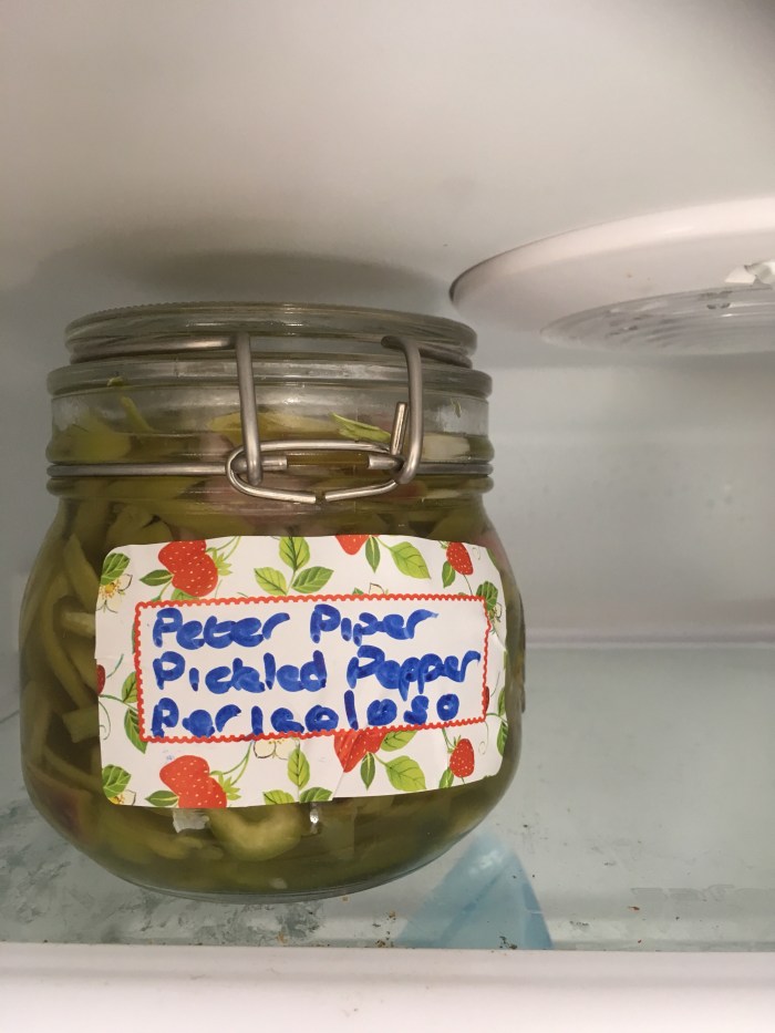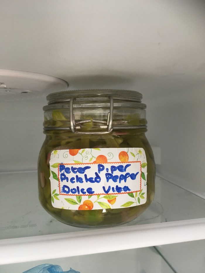 Today J picked and then pickled some sweet peppers and some jalapeño and chilli peppers. They can be stored in the fridge for up to a month.