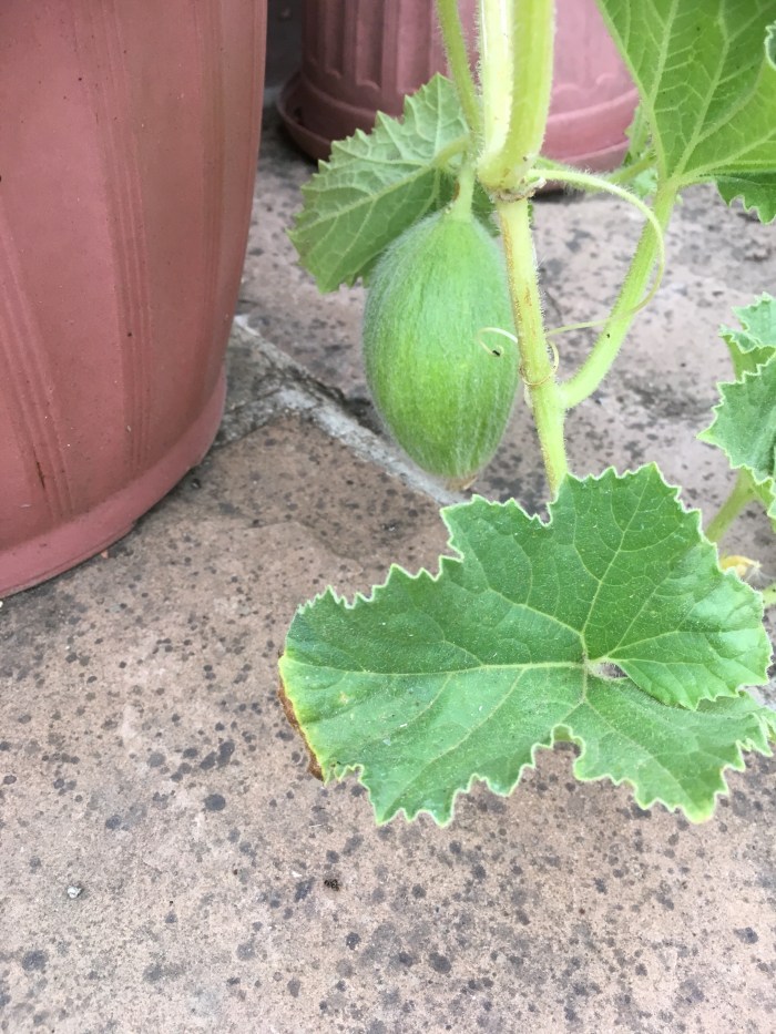 In the courtyard the first tiny melon has formed on the plant. Will it grow and ripen?